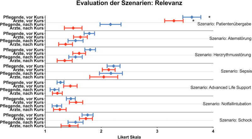 Vier Kurse wurden im gleichen Format durchgeführt und die gesammelten Daten von 24 Intensivpflegekräften und 23 Ärzten hinsichtlich Relevanz, Nutzen und der Bereitschaft einen ähnlichen Kurs wieder zu besuchen ausgewertet. Nach dem Kurs wurden alle Teilnehmer erneut (mittels eines 8-Item-Evaluationsfragebogens) nach der Dauer des Kurses, der Art der Teilnahme, den wahrscheinlichen Auswirkungen auf die eigene Abteilung und der Relevanz der einzelnen Szenarien befragt. Zusätzlich wurde eine Gesamtbeurteilung des Kurses auf einer Skala von 1 (sehr gut) bis 6 (ungenügend) erfragt. Diese Art der Bewertung ist Standard im deutschen Schulsystem, so dass alle Teilnehmer damit vertraut waren.