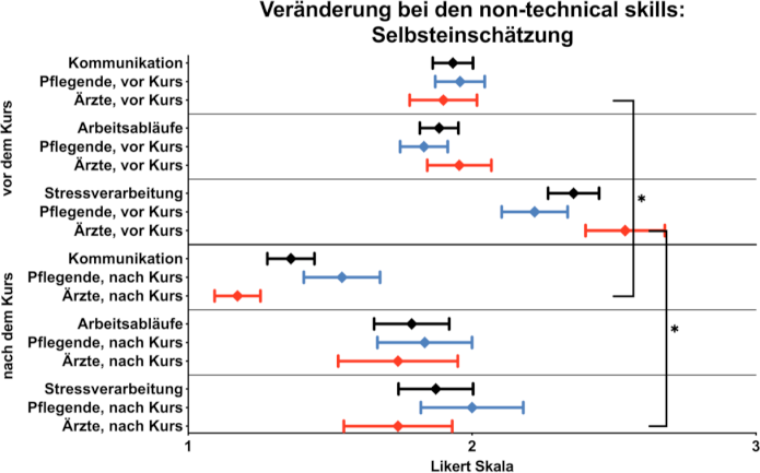 Hinsichtlich der Erwartungen (vor Training) bezüglich der angenommenen Auswirkungen des SBT auf verschiedene nicht-technische Fähigkeiten im Arbeitsumfeld der Teilnehmer wurde eine deutliche Verbesserung der Kommunikationsfähigkeit erwartet (Ärzte 1,90±1,12, Pflegepersonal 1,96±,95). Es wurde eingeschätzt, dass die Arbeitsabläufe verbessert werden (Ärzte 1.96±1.07, Pflegende 1.83±.91) und dass die Bewältigung von Stresssituationen durch den Kurs beeinflusst wird (Ärzte 2.54±1.32, Pflegende 2.22±1.26). Nach dem Kurs (siehe Abbildung 2 [Abb. 2]) wurden die erwarteten Effekte von den Ärzten für die Items Kommunikation (1,17±.39, p=0,01) und Stressbewältigung (1,74±.92, p=0,06) signifikant positiver bewertet. Die Bewertungen durch die Pflegenden haben sich – nach Abschluss des Kurses – nicht signifikant verändert (Kommunikation 1,54±.66; Arbeitsprozesse 1,83±.82; Stressmanagement 2,00±.89). Auch die Bewertung des Items Arbeitsprozesse durch die Ärzte veränderte sich nicht signifikant (1,74±,92).