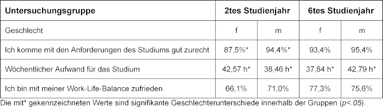 Im 2ten Studienjahr fühlen sich weibliche Studierende seltener den Anforderungen des Studiums gewachsen als männliche Studierende (χ2(1)=5.741, p<.05) (siehe Tabelle 1 [Tab. 1]). Im 6ten Studienjahr besteht dieser Unterschied zwischen den Geschlechtern nicht. Fast alle männlichen und weiblichen Studierenden kommen mit den Studienanforderungen gut zurecht. Sowohl bei Studierenden des 2ten Jahres als auch bei den Studierenden des 6ten Jahres bestehen keine signifikanten Geschlechtsunterschiede hinsichtlich der Zufriedenheit mit der Work-Life-Balance. Bei den Frauen findet sich eine nicht signifikante Tendenz zu größerer Zufriedenheit bei den Studentinnen im 6ten Jahr (77% versus 66%). Weibliche Studierende im 2ten Jahr wenden mit 42,6 Stunden pro Woche signifikant mehr Stunden für ihr Studium auf als männliche Studierende (38,5 Stunden) (t(382)=-2.179, p<.05), während umgekehrt im 6ten Jahr männliche Studierende mit 42,8 Stunden pro Woche signifikant mehr Stunden dem Studium widmen als ihre weiblichen Kolleginnen (37,8 Stunden) (t(150)=-1.723, p<.05).