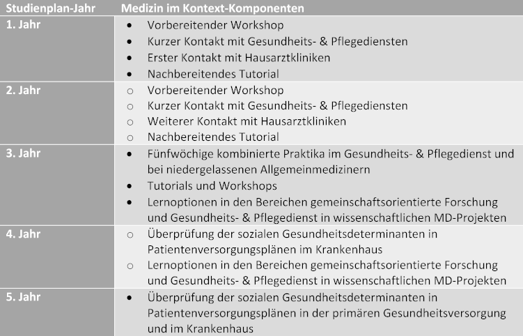 Tabelle 1: Programmpunkte und Struktur des Medizin im Kontext-Programms des MD-Studienplans im Fachbereich Medizin an der Universität West-Sydney.