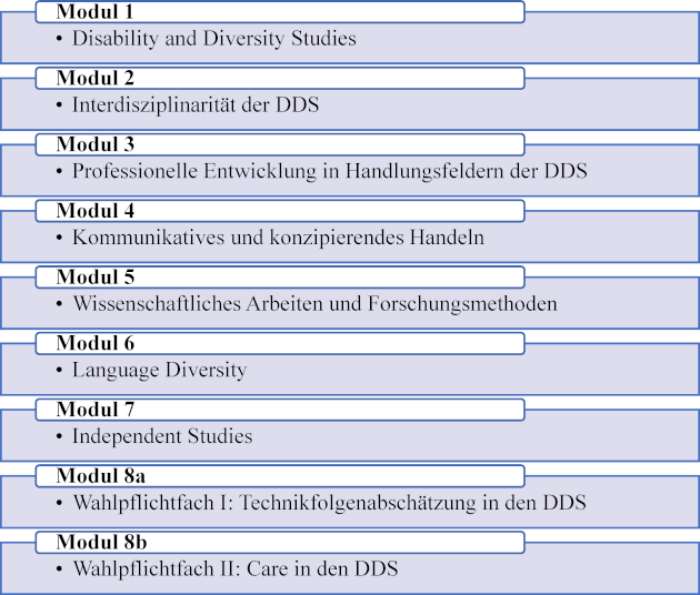 Der Studiengang DDS passt seine Wissenschaftlichkeit und Professionalität stets den sich wandelnden Exklusions- und Marginalisierungsprozessen an, die bspw. aufgrund sich ändernder Arbeitskulturen oder Migrationsbewegungen entstehen. Die Anpassung erfolgt erstens über die Weiterentwicklung des Curriculums, aber auch in den einzelnen Lehrveranstaltungen wird dieser Wandel registriert und thematisch integriert. Diese Aufnahme erfolgt besonders im Modul 1 „Disability and Diversity Studies“ und Modul 2 „Interdisziplinarität der DDS“. Die Studierenden machen sich in diesen Modulen mit den wissenschaftlichen Grundlagen der Disability Studies und Diversity Studies vertraut und befassen sich mit Bezugsdisziplinen, wie unter anderem Psychologie, Pädagogik, Philosophie, Soziologie, Medizin, Recht, Ökonomie. Die Vermittlung theoretischer Grundlagen wird mit praktischen Beispielen verzahnt, um einen Theorie-Praxis-Transfer zu gewährleisten.