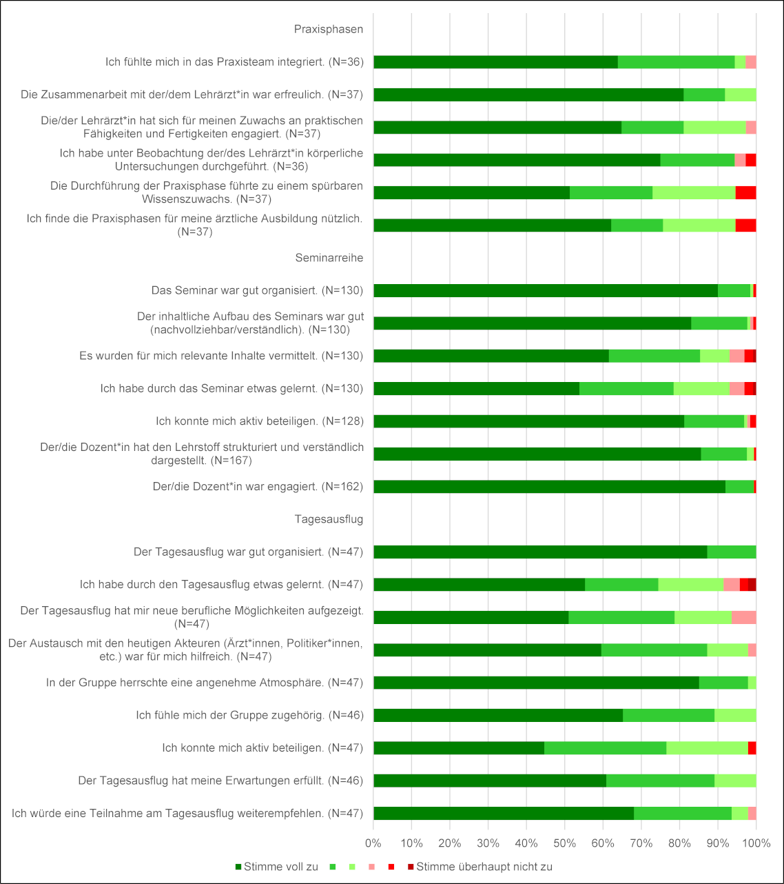 Durch die Online-Befragung konnten Hinweise und Anregungen für die organisatorische sowie inhaltliche Gestaltung der einzelnen Bestandteile des Programms gewonnen werden. So wurde z. B. definiert, dass das Lehrangebot erst ab dem klinischen Studienabschnitt startet und neben dem zentralen Element eines kontinuierlichen Praxisbezugs auch Themen zur Praxisführung und -management Bestandteile in einer begleitenden Seminarreihe sein sollten.