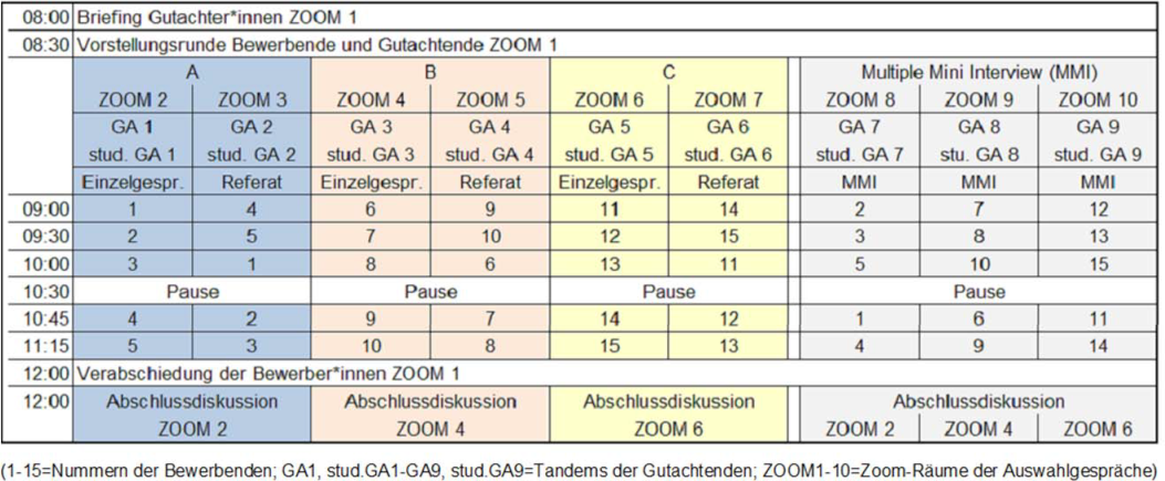 Tabelle 1: Zeitplan eines Vormittags im virtuellen Auswahlverfahren (15 Bewerbende, 9 Tandems mit Gutachtenden, 10 Zoom-Räume)