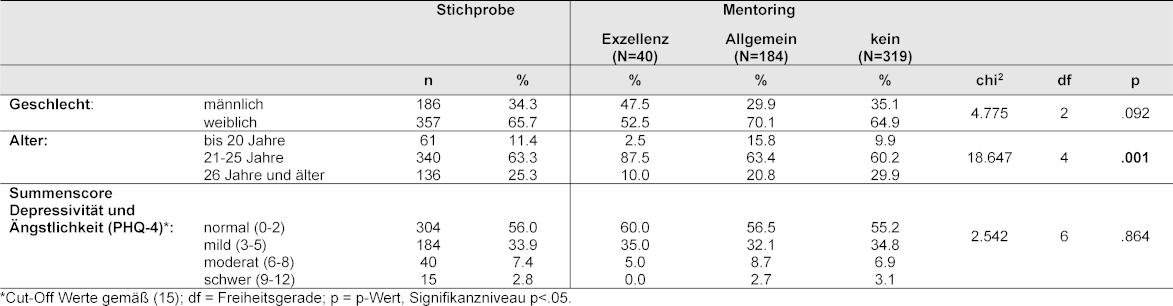 596 von 1193 Studierende der Studienjahre 2 bis 4 nahmen an der Befragung teil. 53 von ihnen mussten aufgrund fehlender Daten zu Alter, Geschlecht und Mentoring-Teilnahme ausgeschlossen werden, was zu einer endgültigen Stichprobe von 543 Studierenden führte. 59% nahmen an keinem Mentoring-Programm teil, während 35% am A-Mentoring und 7% am E-Mentoring teilnahmen. Signifikant mehr E-Mentees als A-Mentees und Nicht-Teilnehmende waren jünger als 26 Jahre, und etwas mehr E-Mentees (60%) berichteten klinisch unproblematische Werte hinsichtlich Angst- und Depressionssymptomen (siehe Tabelle 1 [Tab. 1]). 44% der Teilnehmenden des E-Programms und des A-Programms berichteten, dass ihr Mentor oder ihre Mentorin während der Pandemie digitales Mentoring anbot. 22% im E-Programm und 26% im A-Programm machten von diesem Angebot Gebrauch.