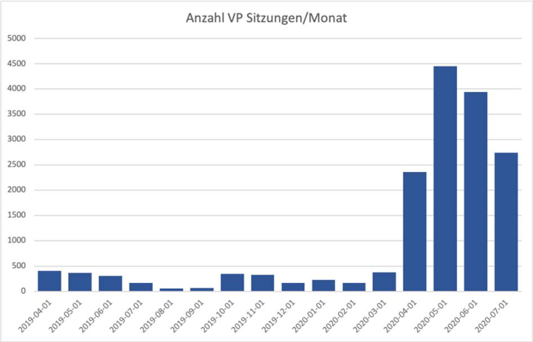 Abbildung 1: Anstieg der Anzahl der Sitzungen/Monat für die öffentlich zugänglichen VP-Kurse für klinisches Entscheiden in Deutsch, Englisch, Polnisch und Spanisch seit April 2019.