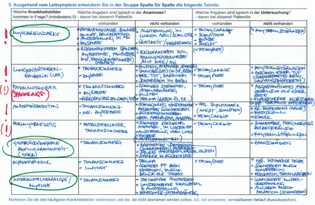 Der erste Fall wurde von 87 von 336 Studierenden abgeschlossen, der zweite von 40 Studierenden. Die von den Studierenden hochgeladenen Tabellen (siehe Abbildung 1 [Abb. 1] und Abbildung 2 [Abb. 2]) wurden von klinischen Experten individuell überprüft und mit Feedback versehen. Die meisten Tabellen zeigten sehr vollständige Differentialdiagnosetabellen mit klar erkennbaren Anfängen der klinischen Entscheidungsfindung und Abwägungsstrategien. Das Feedback betraf die hochgeladenen Differentialdiagnosen und Diagnosetabellen und wurde per E-Mail übermittelt. Das Feedback beinhaltete einen allgemeinen Teil, in dem die Bedeutung der klinischen Entscheidungsfindung hervorgehoben und bei fehlender Mustererkennung aufgrund mangelnder Fachkenntnis die Wichtigkeit von System 2 Reasoning betont wurde. Ein individueller Kommentar zur Vervollständigung der Tabellen sowie zu wichtigen „Red Flags“, die übersehen wurden, und zu Lernlücken ergänzten das Feedback. Dies wurde von den betroffenen Studierenden geschätzt, wie in Kurzevaluationen per E-Mail-Antworten erwähnt (z.B. „hilft bei der Priorisierung in zukünftigen Fällen“, „hatte nicht mit einem so konstruktiven Feedback gerechnet“ und „werde versuchen, Ihren Rat zu befolgen [...] unter Verwendung der Vorlagen und Beschriftungen, um eine bessere Gewichtung und Übersicht zu erhalten“). Dennoch wurde eine praktische Schulung in Anamnese und körperlicher Untersuchung mit realen Patienten schmerzlich vermisst.