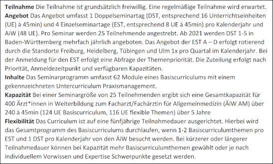 Die Struktur bietet die Möglichkeit von vergleichbaren Angeboten an den vier beteiligten universitären Standorten in Baden-Württemberg. Dadurch kann die inhaltliche Modulausgestaltung auf aktuellem Stand der medizinischen Wissenschaft und der Bildungswissenschaften, wie in der Anlage IV des §75a SGB V gefordert und inhaltlich erwünscht, unter den Mitarbeitenden und Seminarmoderierenden der universitären Standorte ressourcenschonend aufgeteilt werden. Durch die verlässliche Struktur, welche auf Wiederholungen der Themen des Basiscurriculums ausgelegt ist, kann unter Einbezug der Seminarmoderierenden eine didaktische Weiterentwicklung der Inhalte und der Seminargestaltung im Sinne einer Qualitätssicherung und -steigerung innerhalb des Curriculums erfolgen. Ein großer Vorteil des Curriculums ist, dass unterschiedliche Teilnahmedauern (Verlängerung durch Teilzeitarbeit, Elternzeit etc.; Verkürzung durch späten Einstieg während der Weiterbildung) oder auch Versäumnis von einzelnen Seminartagen (z.B. durch Krankheit, keine Freistellung aus Dienstgründen, familiäre Verpflichtungen) flexibel aufgefangen werden können.