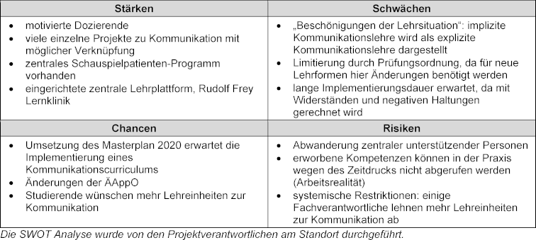 Zu Beginn des Projektes wurden mit Hilfe der SWOT-Analyse [4], [5] standortspezifische Stärken und Schwächen für die Weiterentwicklung des Kommunikationscurriculums eingeschätzt, wobei nach dem Konzept der Institutional Readiness das Vorherrschen einer eher positiven oder negativen Haltung [6], [7], [8] beachtet wurde. Insbesondere die strategischen Implementierungsschritte entlang den Change-Management-Konzepten von Lewin [9] und Kotter [10], [11] ermöglichten, diesen Aspekt zu berücksichtigen. In Lewins Konzept des „Auftauens“ [9] wird betont, dass die betroffenen Personen und das Setting auf anstehende Veränderungsprozesse vorbereitet werden müssen. Ziel ist es, auf breiter Basis eine Überzeugung von der Notwendigkeit einer Veränderung sowie eine emotionale Beteiligung (Begeisterung) zu erreichen.