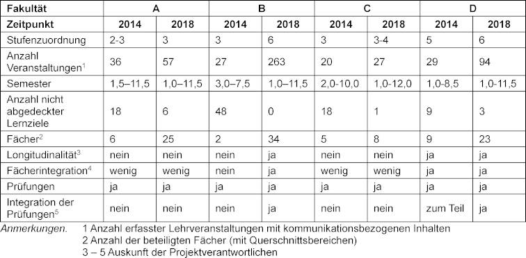 An allen vier beteiligten Fakultäten wurde ein Fortschritt im Reifegrad des Kommunikationscurriculums festgestellt. Insbesondere die Fakultät B sticht hervor, die im Zeitraum von 3-4 Jahren ausgehend von multiplen Einzelkursen ein integriertes Curriculum mit Prüfungen erreicht hat. Möglich war das durch die Entwicklung eines Modellstudiengangs, in den Kommunikation als zentrales Element eingeplant wurde. Durch diese Strategie erfolgte die Implementierung top-down und im Bündel mit anderen Maßnahmen, ganz anders als an den drei anderen Fakultäten, an denen die Initiative von engagierten Einzelpersonen oder kleinen Gruppen überwiegend aus dem Mittelbau ausging.