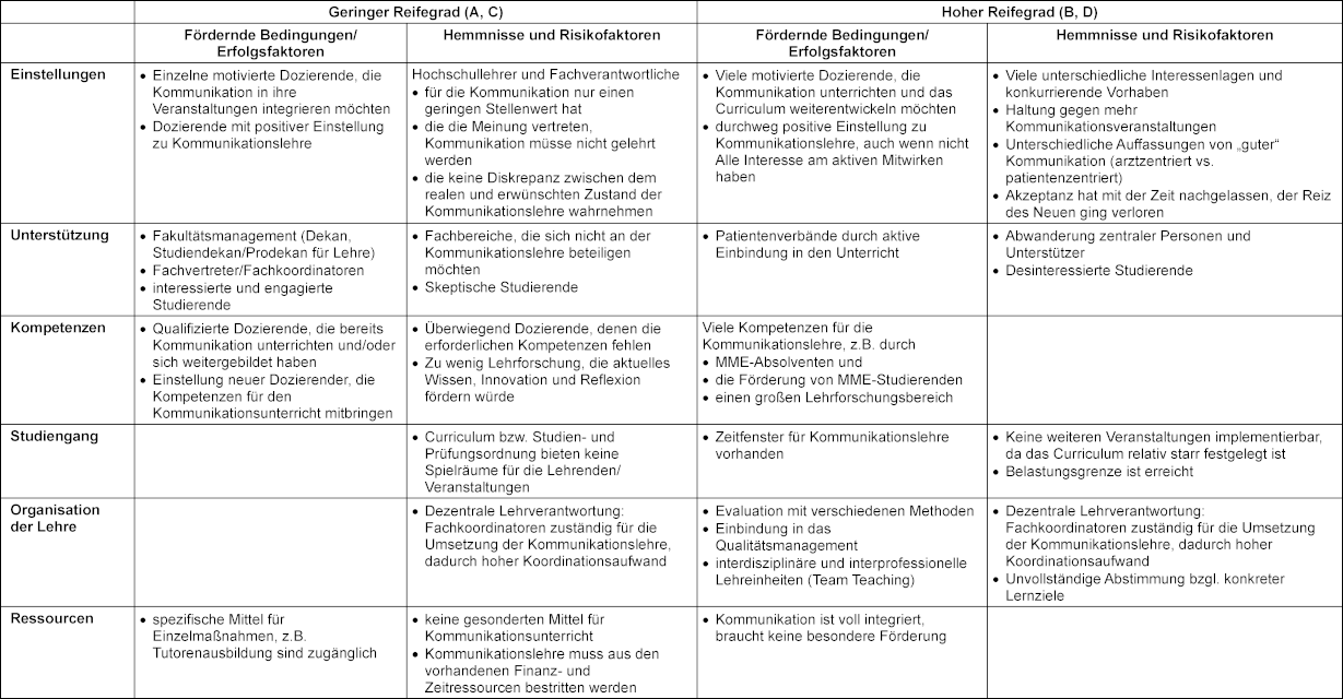 Tabelle 3: Fördernde und hemmende Bedingungen bei geringem und hohem Reifegrad des Kommunikationscurriculums