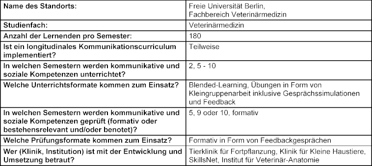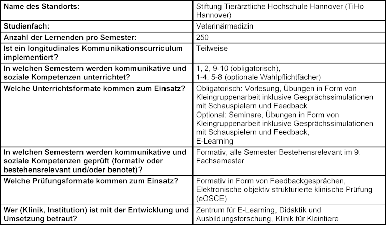 Als weiteres Prüfungsformat wird in Hannover im Rahmen einer elektronischen objektiv strukturierten klinischen Prüfung (eOSCE) für Studierende im Praktischen Jahr in der Klinik für Kleintiere eine Station zur Kommunikation entlang einer Checkliste bewertet [11] (siehe Tabelle 3 [Tab. 3]). Eine Übersicht der derzeitigen Kommunikationslehre an deutschen veterinärmedizinischen Bildungsstätten in Deutschland ist in Anhang 1 [Anh. 1] dargestellt.