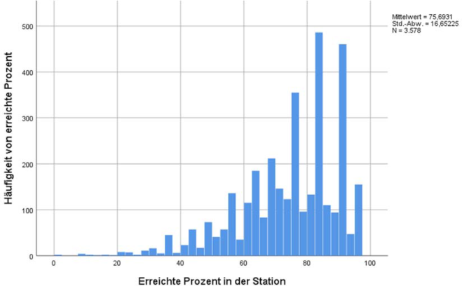 Im Sommersemester 2013 wurde MI als KIT-Prüfungsstation im OSCE des 4. Semesters eingeführt. Die Studierenden erreichten über alle seither vergangenen Semester einen mittleren Score von 75.7% (SD=16.7, N=3578, siehe Abbildung 4 [Abb. 4]). Dies entspricht tendenziell den Leistungen in den anderen Stationen, in denen klinische Fertigkeiten im Vordergrund stehen (78.4%, SD=6.7). Seit dem Sommersemester 2019 wird als KIT-Prüfungsstation im OSCE des 9. Semesters das Überbringen schlechter Nachrichten unter Anwendung des SPIKES-Modells geprüft. Die Studierenden haben seit Einführung der Station im Mittel mit 76.9% abgeschnitten (SD=14.5, N=542, siehe Abbildung 5 [Abb. 5]). Der Mittelwert über alle anderen im OSCE des 9. Semesters eingesetzten Stationen liegt bei 79.7% (SD=7.7).