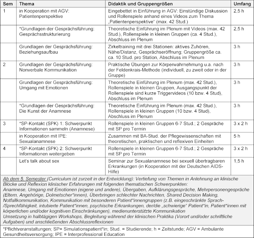Die Ziele und Inhalte der einzelnen Bereiche werden jeweils semesterweise geplant und umfassen bisher die ersten vier Semester. Für den klinischen Abschnitt orientieren sich erste Konzepte an den Kontexten und Bedarfen der Studierenden und der klinischen Einsatzorte. Sämtliche Veranstaltungen unterliegen einer kontinuierlichen Weiterentwicklung auf der Basis der studentischen Rückmeldungen und curricularen Rahmenbedingungen. Die Veranstaltungen umfassen zumeist eine Kombination aus theoretischem Input (z.B. Modelle, Studienergebnisse, Techniken), Üben in kleinen Gruppen (z.B. in Rollenspielen) sowie Raum für Reflexion und gegenseitigen Austausch. Eine enge Verzahnung mit anderen Teilen des Curriculums wird angestrebt (z.B. Psychosomatik, POL, ambulante Gesundheitsversorgung, interprofessionelle Ausbildung, Integriertes Begleitstudium Anthroposophische Medizin).