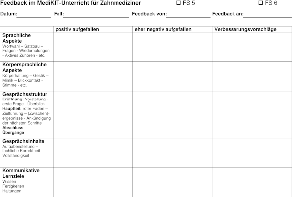 Das ZahnMediKIT-Konzept ging aus dem MediKIT-Konzept der Humanmedizin hervor [35] und wurde an die Lehr-Lern-Bedingungen in der Zahnmedizin adaptiert. Die Studierenden erhalten in einer Einführung Input über die Funktion, das Geben und Erhalten von Feedback (siehe Abbildung 2 [Abb. 2]) [36], [37], [38]. Die Gespräche werden bewusst ohne theoretischen, kommunikationswissenschaftlichen Unterbau bewältigt. So sind möglichst authentische Gesprächssituationen zu erleben, in denen sich der persönliche Kommunikationsstil der Studierenden entfalten kann. Die Fallvignetten beziehen sich auf bereits erworbenes Fachwissen und beinhalten Aufgaben (z.B. „Bereiten Sie den Patienten auf die anstehende Zahnlosigkeit und das Tragen einer Totalprothese vor.“) sowie kommunikative Lernziele (z.B. „Typische sensible Themenfelder, z.B. Ängste, erkennen und darauf reagieren.“). Die Studierenden üben, eine Beziehung zu Patient*innen aufzubauen und individuelle Anliegen im Gespräch zu berücksichtigen. Außerdem erleben sie durch die Beobachtung ihrer Kommiliton*innen, wie unterschiedlich der Kontakt gestaltet werden kann. Die Kleingruppen bestehen aus drei Studierenden. Das Feedback setzt sich aus Betrachten der eigenen Videoaufzeichnung mit Selbsteinschätzung und den Rückmeldungen von SP, den Kommuliton*innen und der Lehrperson zusammen. Zur Unterstützung der Studierenden wird ein Dokumentationsbogen eingesetzt, der die Feedbacks mit Hilfe von kommunikativen Kriterien, sowie der Erfüllung von Aufgabenstellung und Lernzielens strukturiert (siehe Abbildung 3 [Abb. 3]). Im folgenden Unterrichtsgespräch werden Gesprächsalternativen erörtert. Es besteht die Möglichkeit, relevante Gesprächsabschnitte im Sinne eines microteachings zu wiederholen, um erarbeitete Varianten auch praktisch zu erleben.