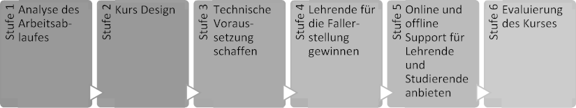 Abbildung 1: Durchführen eines fallbasierten Lernkurses - Arbeitsablauf. ©Ertl 2020, adapted from: A framework for designing and delivering blended e-learning [2], [3], [27], [48]