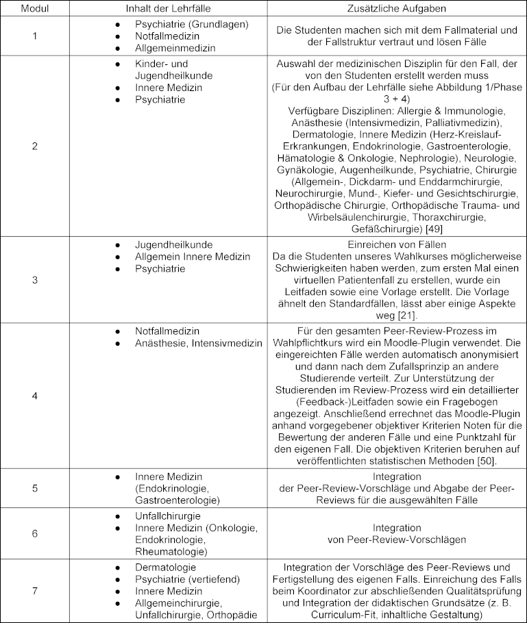 Das E-Learning findet in zwei aufeinander folgenden Schritten statt: Im ersten Teil des Kurses sollen die Studierenden Patientenfälle lösen, die vom E-Learning-System bereitgestellt werden. Im zweiten Teil sollen die Studierenden die Rolle wechseln, zum Lehrer werden und eine Fallgeschichte für andere Studierende erstellen. Letztere werden später von anderen Teilnehmern des Wahlkurses in einem Peer-Review-Verfahren anonym bewertet. Dieser Schritt in unserem Kurs zielt darauf ab, eine andere Perspektive zu bieten, um unseren Studenten zu zeigen, dass Lehren und Lernen die Anstrengung von beiden, Lehrern und Studenten, erfordert [3], [28] und zudem eine hohe Lerneffizienz hat.