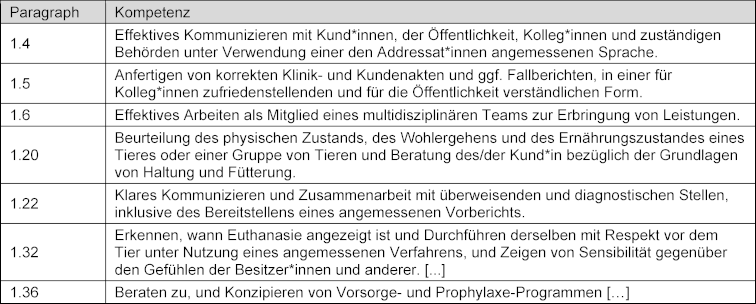 Selbst im nicht-akademischen Bereich der Tiermedizin, nämlich bei den Tiermedizinischen Fachangestellten, ist kommunikative Kompetenz explizit als Ausbildungsziel verankert [https://www.gesetze-im-internet.de/tiermedfangausbv/BJNR252200005.html]. Verschiedene Kommunikationsformen und Kommunikationsmethoden zur Beratung und Betreuung von Tierhalter*innen müssen dabei ebenso erlernt werden, wie das Verhalten in Konfliktsituationen.