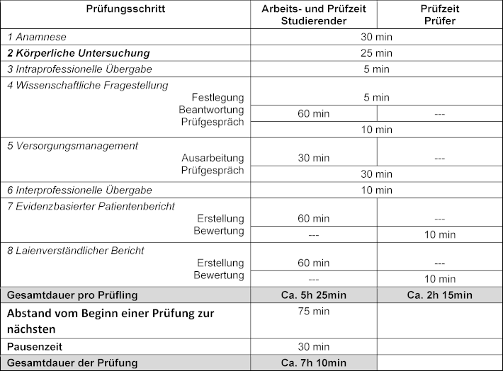 Die Prüfung umfasst acht Schritte: eine umfassende Anamnese und eine vollständige körperliche Untersuchung des Patienten unter Aufsicht zweier Prüfer, eine intraprofessionelle Übergabe an die ärztlichen Prüfer, die Erstellung einer wissenschaftlichen Fragestellung als PICO-Frage (Population-Intervention-Comparison-Outcome) [12] zur Beantwortung mittels internetbasierter Literaturrecherche, die Erarbeitung von Vorschlägen zum ambulanten Versorgungsmanagement, eine strukturierte interprofessionelle Übergabe an eine an der Gesundheitsversorgung des Patienten beteiligte Person einer anderen Berufsgruppe und die Erstellung eines ärztlichen Befundberichtes sowie eines laienverständlichen Berichtes an den Patienten.