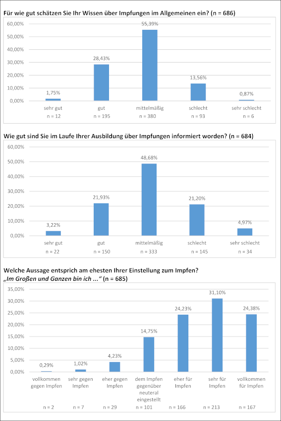 Methodik: Im Frühjahr 2018 nahmen sieben Pflegeschulen in Hessen an einer anonymen Fragebogenstudie teil. Insgesamt wurden 690 Fragebögen von Schülerinnen und Schülern verschiedener medizinischer Ausbildungsberufe in die Studie aufgenommen. Der Inhalt der Fragen orientierte sich an den Empfehlungen der Ständigen Impfkommission (STIKO), einer Literaturrecherche, sowie an den Beispielfragen der Weltgesundheitsorganisation (WHO) bezüglich „vaccine hesitancy“. Ebenso erfolgte die Auswertung von Impfpässen anhand der STIKO-Empfehlungen hinsichtlich Standardimpfungen, sowie den beruflich bedingten Impfungen für Beschäftigte im Gesundheitswesen.
