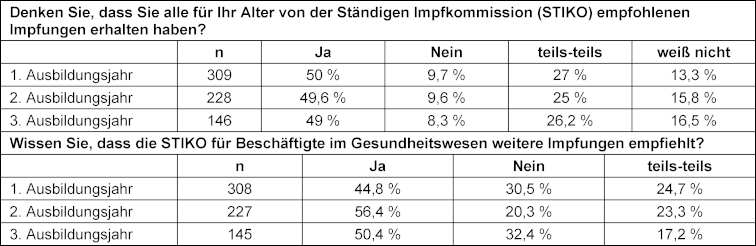 Die vermehrte Information über Impfungen führte auch scheinbar nicht dazu, dass die Schülerinnen und Schüler im letzten Ausbildungsjahr besser über die aktuellen STIKO-Empfehlungen informiert wären als zu Beginn ihrer Ausbildung. Nur ca. die Hälfte aller Schülerinnen und Schüler gaben über alle Ausbildungsjahre hinweg an, dass sie denken alle von der STIKO empfohlenen Impfungen erhalten zu haben und ebenfalls nur ca. die Hälfte aller Schülerinnen und Schüler gaben an, dass ihnen bekannt ist, dass die STIKO überhaupt für Beschäftigte im Gesundheitswesen weitere Impfungen empfiehlt. Dies würde bedeuten, dass ca. die Hälfte aller Absolventinnen und Absolventen am Ende des dritten Ausbildungsjahres und damit kurz vor dem Start in den Beruf (bei korrekter Selbsteinschätzung) einen unvollständigen Impfschutz hätten und nicht über speziell für Beschäftigte im Gesundheitswesen empfohlen Impfungen Bescheid wüssten.
