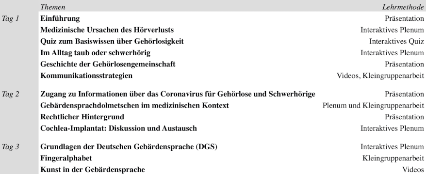 die direkte Interaktion der Teilnehmenden miteinander. Aufgaben konnten in Kleingruppen bearbeitet werden und auch Grundlagen der Deutschen Gebärdensprache (DGS) wurden vermittelt. Wie aus Abbildung 1 [Abb. 1] hervorgeht, bestand der Workshop aus drei zweistündigen Sitzungen innerhalb einer Woche. Er wurde im April 2020 insgesamt dreimal durchgeführt. Von den Teilnehmenden wurde erwartet vor jeder Sitzung 30-60 Minuten in die individuelle inhaltliche Vorbereitung zu investieren. Das Material zur Vorbereitung wurde rechtzeitig bereitgestellt. Jede Sitzung wurde von einer Gruppe von drei bis vier Medizinstudierenden geleitetet, die bereits Erfahrung in der Durchführung von Gehörlosigkeits-Sensibilisierungs-Workshops hatten. Sie alle wurden im Rahmen des Projekts geschult und engagieren sich seit mehreren Jahren für Breaking the Silence. Um den Teilnehmenden die Möglichkeit zu geben Grundkenntnisse der Gebärdensprache zu erwerben, wurde die dritte Sitzung zudem von einer tauben Gebärdensprachdozentin begleitet.