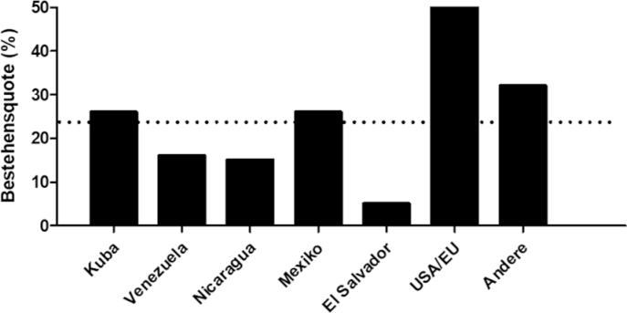 Absolventen aus Kuba, Venezuela, Nicaragua und Mexiko machen zusammen 87,6% aller Prüflinge aus. Diese Hauptgruppe weist Bestehensquoten zwischen ~15% und ~25% und damit eine relativ geringe Streuung auf. Absolventen aus El Salvador und USA/EU machen dagegen zusammen nur 3,9% aller Prüflinge aus, was die sehr starke Streuung dieser Gruppen erklären könnte. Hierfür spricht auch die Tatsache, dass die Gruppe Andere, mit 109 Prüflingen (vergleichbar mit Nicaragua) deutlich näher am Mittelwert liegt als die Gruppe USA/EU, die lediglich aus 10 Prüflingen besteht. Ursache für die starke Streuung ist also nicht unbedingt eine generalisierbare stärkere Leistung der Absolventen aus USA/EU, oder eine schlechtere der aus El Salvador. Eine alternative, ebenfalls plausible Erklärung der Streuung ist jedoch auch die Tatsache, dass die Absolventen der Gruppe USA/EU ihr Studium in Universitäten absolviert haben, die sich in der Regel deutlich über der Position der mittelamerikanischen und karibischen Universitäten in den internationalen universitären Rankings befinden. Dadurch wäre die höhere Bestehensquote dieser Gruppe tatsächlich durch eine bessere Vorbereitung durch ihr Studium zu erklären.