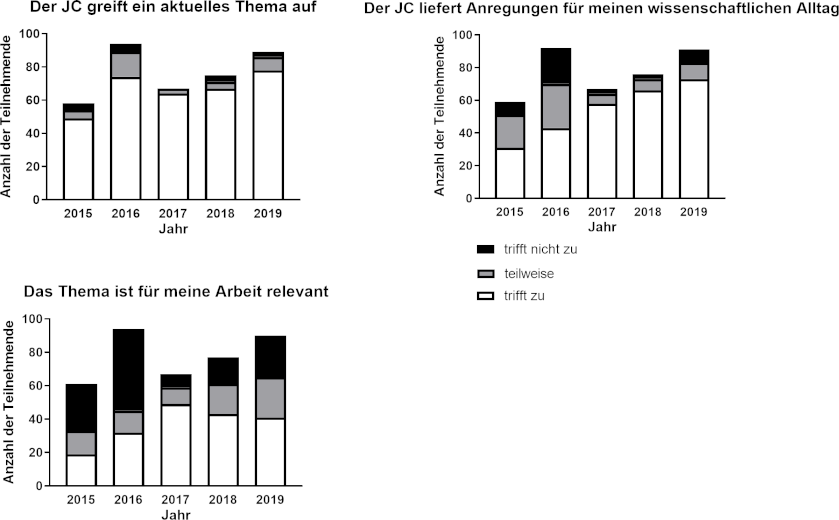 Alle Promotionsstudierenden erhielten bei jeder JC-Sitzung einen Fragebogen. Alle Antworten auf jede Frage des Fragebogens wurden für jede Sitzung summiert. Für jede Frage wurde die Anzahl der Teilnehmenden, die eine positive, eine negative oder eine neutrale Kategorie auf der Likert-Skala ankreuzten, separat zusammengezählt. Die Antworten „trifft nicht zu“ und „trifft eher nicht zu“ sowie die Antworten „trifft eher zu“ und „trifft zu“ wurden zusammengeführt. Diese Zusammenführung der beiden „positiven“ sowie der beiden „negativen“ Kategorien wird üblicherweise durchgeführt, um ein deutlicheres Bild der Ergebnisse einer Likert-Skala zu zeichnen, ohne dass Informationen verloren gehen. Grafiken und Analysen wurden mit GraphPad Prism 5 (GraphPad Software, Inc.) erstellt.