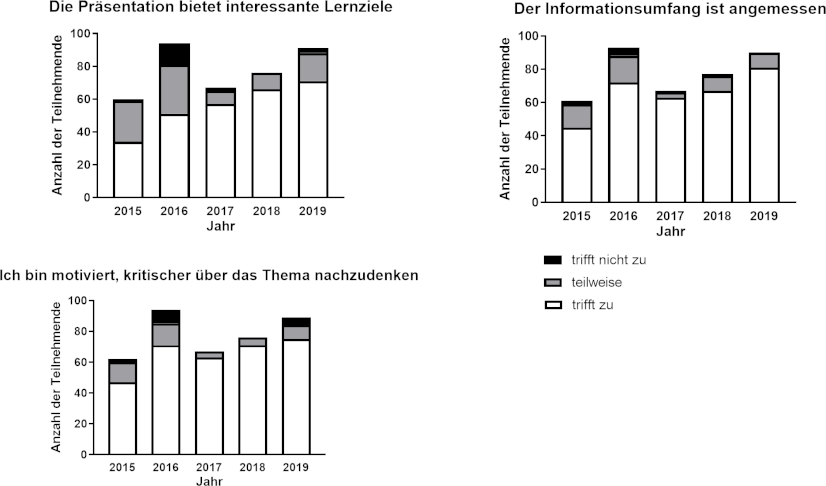 In dieser Studie wurde nicht untersucht, wie sich die Teilnahme an einem JC auf die Entwicklung des kritischen Denkens der Promotionsstudierenden auswirkt. Dennoch sollte herausgestellt werden, wie die Teilnehmenden ihre Motivation für kritischeres Denken über das im JC besprochene Thema beurteilten. In den ersten beiden Jahren antworteten etwa 75% der Teilnehmenden auf die Frage danach, ob sie motiviert waren kritischer zu denken, mit „trifft eher zu“ oder „trifft zu“. Dieser prozentuale Anteil stieg ab 2017 und erreichte ein Maximum von 95% (siehe Abbildung 5 [Abb. 5]).