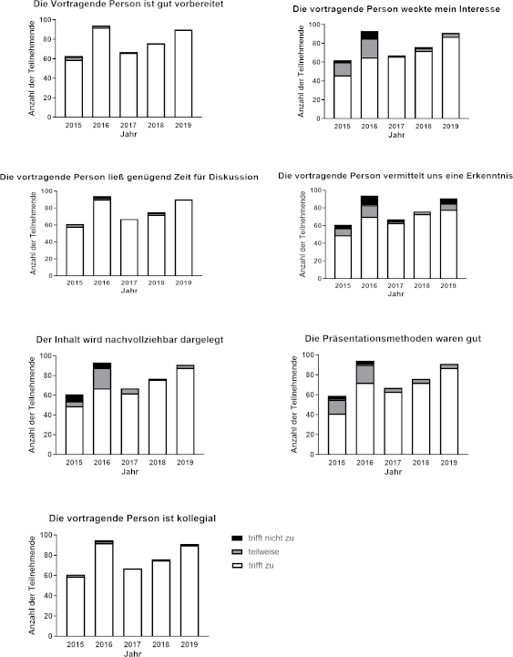 Zunächst sollten die Teilnehmenden die JC-Sitzung insgesamt evaluieren (d. h. Organisation, Verständlichkeit und allgemeine Einschätzung des Nutzens der Veranstaltung). Der JC allgemein wurde insgesamt positiv wahrgenommen („trifft eher zu“ oder „trifft zu“ wurde von mehr als 70% aller Teilnehmenden angekreuzt). Hier sei darauf hingewiesen, dass eine Tendenz zu einer positiveren Wahrnehmung des JC ab 2017 begann, die Wahrnehmung zunehmend positiver wurde und dann in den folgenden Evaluationsjahren stabil blieb (siehe Abbildung 2 [Abb. 2]).