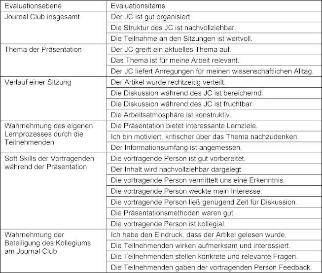 Tabelle 1: Fragebogen zur Evaluation der Wahrnehmung der Journal-Club-Sitzungen
