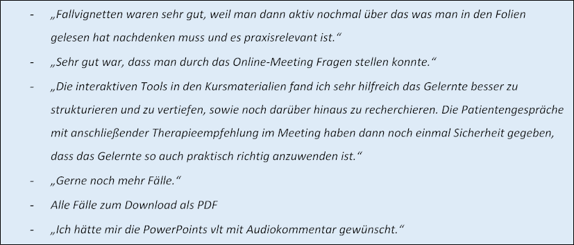 Ergebnisse: Die Umfrage unter Studierenden ergab den Wunsch nach praxisnaher Ausbildung ohne „Frontalunterricht“. Das entstandene Projekt realisierte diesen Aspekt durch die Theorie-Vermittlung während eines Online-Moduls mit Fallvignetten und interaktiven Lernaufgaben. Die anschließende Online-Präsenzzeit während des ZOOM-Meetings ermöglichte es den Studierenden, die gelernten Inhalte zu wiederholen und zu vertiefen und individuelle Fragen zu stellen. 170 Studierende absolvierten das gesamte Online-Programm, davon lagen für 75 Studierende Evaluationsdaten vor. Die Selbsteinschätzung der Bearbeitungsdauer lag im Durchschnitt bei 4–6 Stunden. Im freien Feedback wurden 90 Aspekte angesprochen, darunter vor allem inhaltliche Anmerkungen (43%), Lob (33%) und Anmerkungen zu technischen Problemen (23%). Nach Einschätzung der Moderatoren können die Studierenden in der Präsenzphase die Schmerzanamneseerhebung strukturiert durchführen, allerdings stellt die Unterbreitung des Therapievorschlages eine besondere Hürde dar.