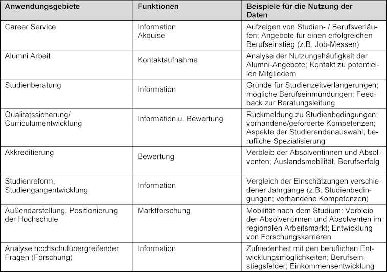 Tabelle 1: Anwendungsgebiete und Funktionen von Befragungen von Absolventinnen und Absolventen an Hochschulen in Anlehnung an Janson [21]