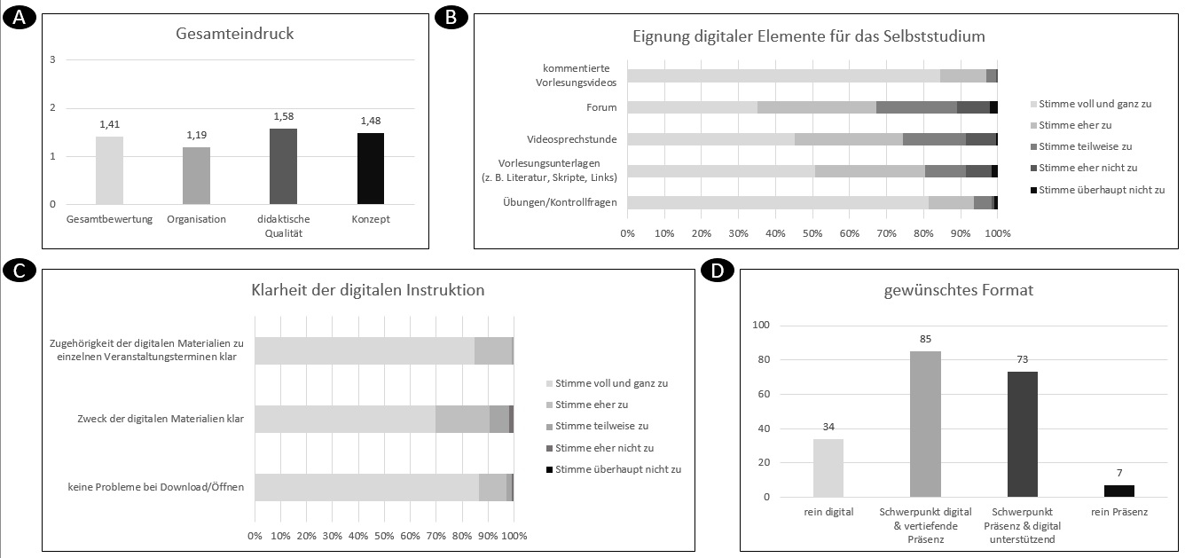 Nach Abschluss der Vorlesung erfolgte eine anonyme Evaluation über die interne Lernplattform durch die Studierenden. Diese enthielt selbstentwickelte Items, die auf das entwickelte digitale Konzept der Veranstaltung jenseits der summativen Gesamtevaluation durch die Fakultät abgestimmt waren. Es wurden der Gesamteindruck der Veranstaltung, die Bewertung der didaktischen Elemente und Methoden, die Klarheit der digitalen Instruktionen sowie die künftig gewünschte Präsenzform erfragt. Das Antwortformat folgte dem Schulnotenprinzip (Note 1-6) oder einer 5-stufigen Likert Skala („stimme voll und ganz zu“ bis „stimme überhaupt nicht zu“). Zuletzt waren auch Freitextantworten zu weiteren, gewünschten digitalen Elementen und einer offenen Kritik möglich. Die offene, qualitative Freitextevaluation bestand aus zwei Fragen: