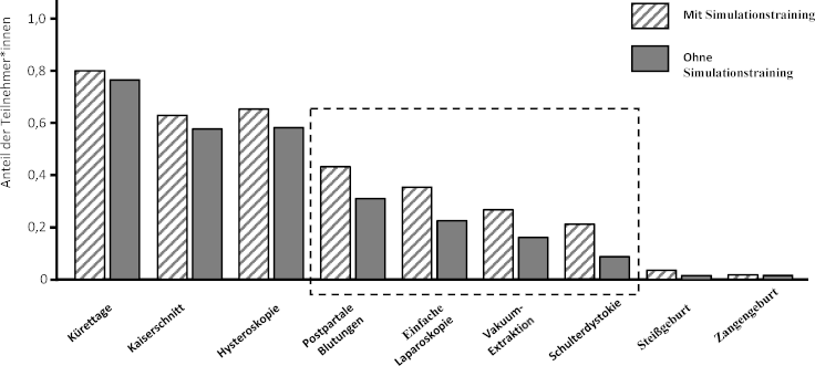 Wurde in den betreffenden Kliniken der Teilnehmer*innen ein Simulationstraining in der Geburtshilfe (44% mit Simulationstraining) oder Gynäkologie (20%) angeboten, resultierte dies in einer deutlichen Steigerung der Sicherheit bei all jenen Weiterbildungsassistent*innen, die das Simulationstraining für ihre Weiterbildung nutzen konnten. Insbesondere bei jenen Eingriffen (einfache Laparoskopie, Management von Nachblutungen oder Schulterdystokie und Vakuumextraktion), die in jedem Krankenhaus jederzeit auftreten können, fühlen sich die Weiterbildungsassistent*innen mit Simulationstraining bis zu 12% sicherer als die Teilnehmer*innen ohne (siehe Abbildung 4 [Abb. 4]; Kasten mit gestrichelter Linie: deutliche Unterschiede zwischen „mit“ und „ohne“ Simulationstraining).