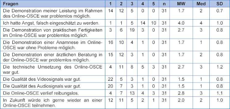 31 von 34 (91%) der Studierenden (Studiengruppe) füllten den Evaluationsfragebogen aus (siehe Tabelle 2 [Tab. 2]). Die Mehrheit der Studierenden war der Meinung, dass die Demonstration ihrer Leistungen problemlos möglich war und sie keine Angst hatten, aufgrund des neuen Formats falsch beurteilt zu werden. Auch die Demonstration der anamnestischen und beraterischen Kompetenzen wurde von den Studierenden als unproblematisch eingestuft. Die Demonstration praktischer Fertigkeiten, wie die Durchführung einer strukturierten Gesichtsuntersuchung, wurde jedoch als problematischer angesehen. Die Video- und Audioqualität wurde insgesamt als sehr gut bewertet und die meisten Studierenden gaben an, dass sie gerne an zukünftigen Tele-OSCEs teilnehmen würden.