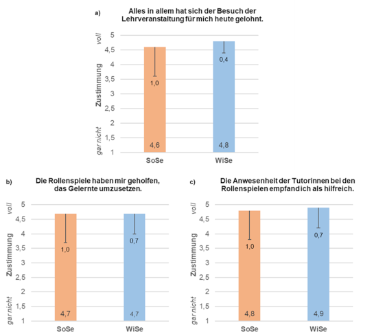 Die Kurse wurden hinsichtlich Lehrqualität, subjektivem Lernerfolg, studentischer Akzeptanz und Motivation evaluiert. Den Evaluationsfragebogen füllten im SoSe 17 von 22 Studierenden (77%) und im WiSe 43 von 46 Studierenden (94%) aus. Die Evaluationsergebnisse zeigten sich durchweg positiv: Der Besuch der Lehrveranstaltung wurde von 11,8% (SoSe) bzw. 16,7% (WiSe) als eher lohnenswert und von 82,4% (SoSe) bzw. 83,3% (WiSe) als sehr lohnenswert empfunden. Im Mittel zeigte sich bei dieser Aussage eine Zustimmung von 4,1 (SD=1,0; SoSe) bzw. 4,8 (SD=0,4; WiSe) (siehe Abbildung 4a [Abb. 4]). Die Übungsgespräche, die auch in bereits bestehenden Anamnesemodulen der Würzburger Lehre tragende Methode sind, waren für 5,9% (SoSe) bzw. 23,8% (WiSe) eine eher hilfreiche Möglichkeit und für 88,2% bzw. 73,8% eine sehr hilfreiche Möglichkeit, das zuvor erworbene Wissen praktisch umzusetzen. Der Transferunterstützung durch die Übungsgespräche wurde durchschnittlich mit 4,7 (SD=1,0; SoSe) bzw. 4,7 (SD=0,7; WiSe) zugestimmt (siehe Abbildung 4b [Abb. 4]). Besonders das Peer Teaching durch die Tutor*innen wurde mit einer mittleren Zustimmung von 4,8 (SD=1,0; SoSe) bzw. 4,9 (SD=0,7; WiSe) als unterstützend wahrgenommen (siehe Abbildung 4c [Abb. 4]). 92,9% (SoSe) bzw. 94,1% (WiSe) der Studierenden empfanden die Anwesenheit der Tutor*innen als hilfreich. Hervorzuheben ist auch, dass ein offenes Klima in den Kursen herrschte (88,2% im SoSe bzw. 88,1% im WiSe) und die Veranstaltung eine gute Mischung aus Wissensvermittlung und Übung aufzeigte (81% im SoSe bzw. 88,2% im WiSe). Auch die weiteren Ergebnisse, die in Tabelle 1 [Tab. 1] zu finden sind, spiegeln eine erfolgreiche Pilotierung.