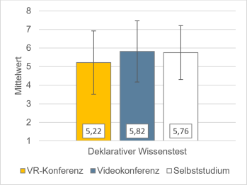 Das räumliche Verständnis fiel in der VR-Konferenz höher aus als in den beiden anderen Formaten. Beim deklarativen Verständnis zeigt sich die Präferenz für VR deskriptiv nur gegenüber den Videokonferenzen (siehe Abbildung 5 [Abb. 5]). Im objektiven Wissenstest, bei dem sich kein Format absetzen konnte, schnitt die VR-Konferenz deskriptiv geringfügig schlechter ab (siehe Abbildung 6 [Abb. 6]).