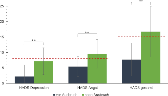 Abbildung 4: Veränderungen im HADS-Summenwert. Veränderung der Summenwerte für die HADS-Gesamtskala und die Angst- und Depressionsunterskalen vor Ausbruch der Pandemie im Vergleich zu den Werten nach Ausbruch der Pandemie. Die gestrichelte Linie entspricht den Grenzwerten für einen klinisch auffälligen Wert.