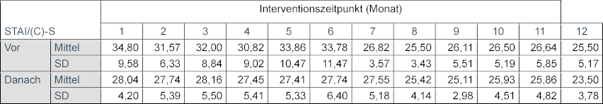 Der STAI-S wurde vor und unmittelbar nach jedem Hundetraining (nur Interventionsgruppe) zu zwölf bzw. sechs Zeitpunkten bei Kindern und Jugendlichen eingesetzt.