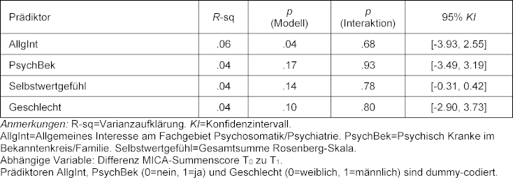 Anschließend erfolgte die Berechnung einer Moderatoranalyse zur Testung der Hypothese H3. Hierbei wurde die Gruppenzugehörigkeit als unabhängige Variable und die Differenz zwischen MICA4-Summenscore zu T0 und T1 als abhängige Variable gewählt. Neben Geschlecht wurden AllgInt, PsychBek und Selbstwertgefühl als mögliche Moderatorvariablen in das Modell eingesetzt.