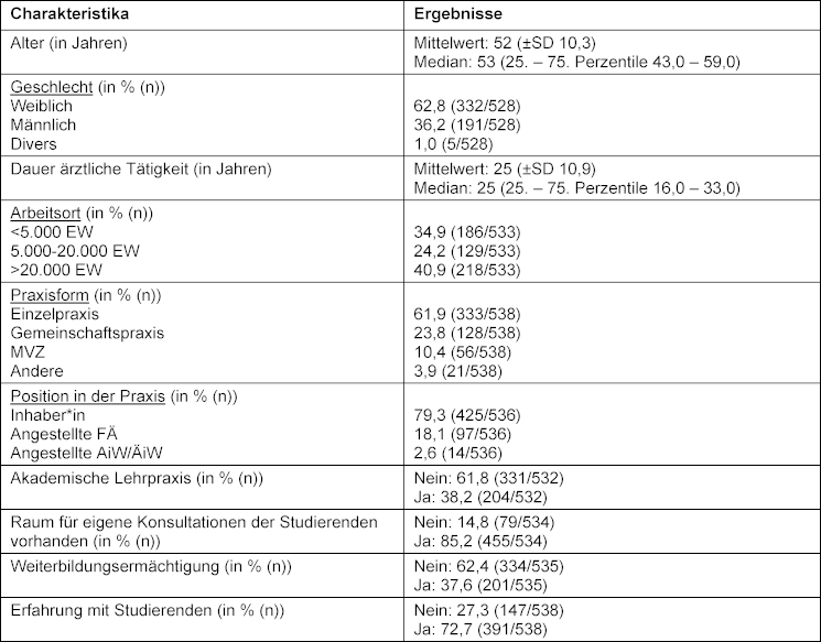 Es nahmen 538/1.513 Hausärzt*innen an der Befragung teil, der Rücklauf betrug damit 35,8%. Die Befragten waren überwiegend weiblich, im Mittel 52 Jahre alt und vorwiegend als Inhaber*innen in Einzelpraxen tätig. Insgesamt 72,7% gaben Erfahrungen mit Studierenden an; 38,2% waren in Lehrpraxen tätig, siehe Tabelle 1 [Tab. 1].