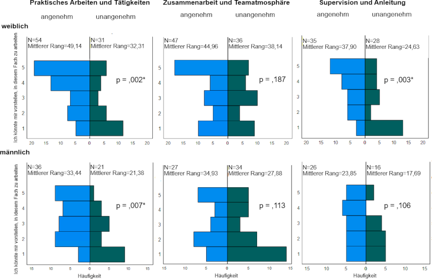 Der Einfluss der Qualität der berichteten Erlebnisse auf die Berufswünsche wurde mit dem Mann-Whitney-U-Test für paarweise Vergleiche in jeder Kategorie für weibliche und männliche Studierende mit einem Bonferroni-korrigierten p-Wert auf dem Niveau von p<,017 gemessen. Antworten von Studierenden, die angaben, beide Qualitäten erlebt zu haben, wurden hierbei nicht berücksichtigt, da sie nicht in eine Richtung weisen.