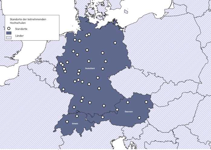 Abbildung 1: Standorte der teilnehmenden Fakultäten in Deutschland, Österreich und der Schweiz (erstellt durch Marie Sander)
