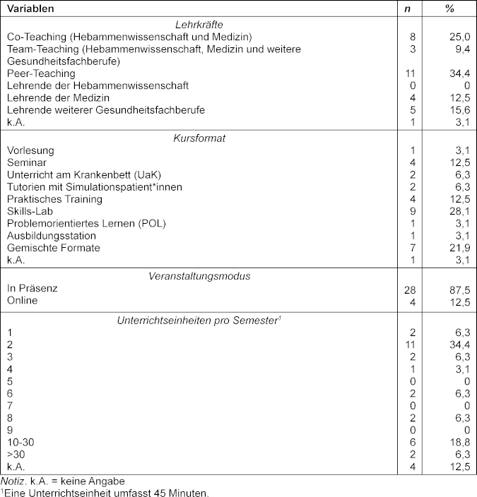 In Bezug auf den Zeitpunkt im Studium gab es einen Unterschied zwischen den Studiengängen. Während 90% der Kurse (n=28) für Hebammenwissenschaftsstudierende eines bestimmten Fachsemesters konzipiert waren (vorrangig für das erste (28%, n=9), zweite (13%, n=4), dritte (19%, n=6) oder vierte (13%, n=4) Fachsemester), wurden bei vierzehn dieser Kurse Medizinstudierende aus zahlreichen verschiedenen Semestern einbezogen. Weitere siebzehn Kurse (N/A=1) zielten zwar auf die Teilnahme Medizinstudierender aus einem bestimmten Fachsemester ab, jedoch verteilt auf den gesamten Studienverlauf. An den Kursen waren durchschnittlich mehr Medizin- als Hebammenwissenschaftsstudierende beteiligt (siehe Tabelle 2 [Tab. 2]). Der Großteil der Kurse wurde von Peer-Tutor*innen oder von einem Lehr-Tandem begleitet (siehe Tabelle 3 [Tab. 3]).