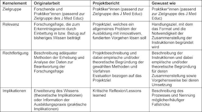 Mit Blick auf Erstellung und Begutachtung von Artikeln zur Ausbildungsforschung wurden gemeinsame Kernelemente identifiziert, die je Artikeltyp entsprechend definiert werden müssen. Davon ausgehend wurden für die Artikeltypen Projektbericht und Gewusst wie (von den Autor*innen) zu adressierende Aspekte und (von den Gutachter*innen zu berücksichtigende) Bewertungskriterien konsentiert. Beim Fehlen von Kernelementen kann demnach die Ablehnung eines Manuskripts erfolgen. Überarbeitungsbedarf ist gegeben, wenn zu adressierende Aspekte nicht ausreichend oder nicht gut nachvollziehbar beschrieben werden.