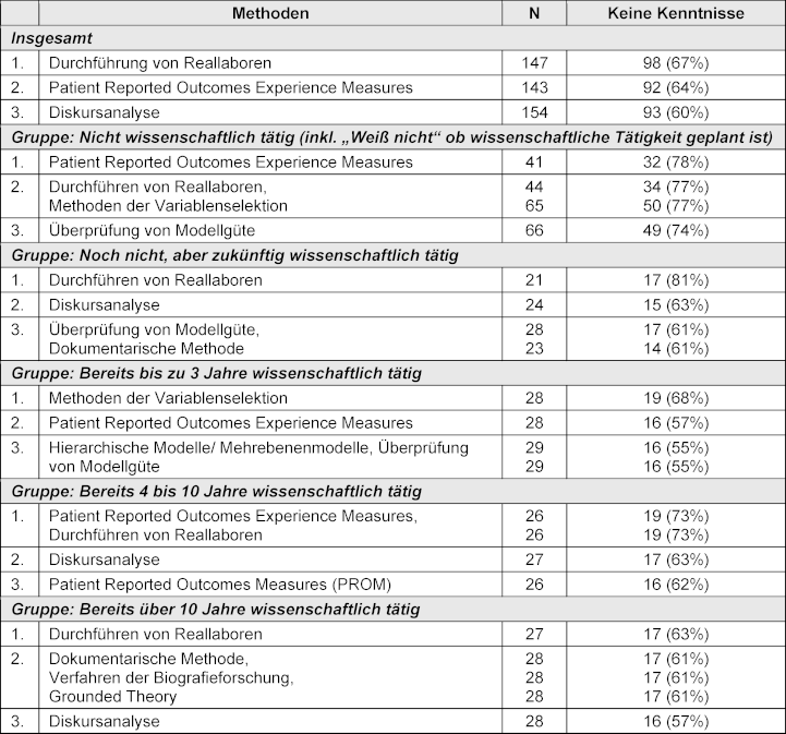 Tabelle 3: Die drei am häufigsten genannten fehlenden Kenntnisse in wissenschaftlichen Forschungsmethoden insgesamt und gruppiert nach wissenschaftlicher Erfahrung der Teilnehmenden