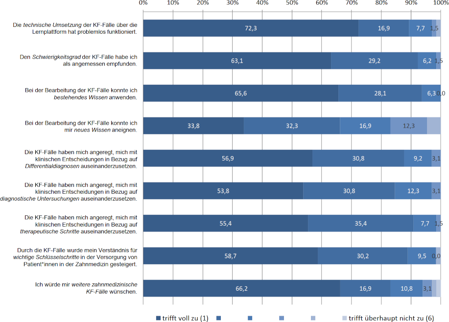 Der Evaluationsfragebogen wurde anonym von 65 der 71 Studierenden (=91,5%) ausgefüllt. Die studentischen Bewertungen der neun geschlossenen Items zeigten u.a., dass die technische Umsetzung der virtuellen Fälle gut funktioniert hat, dass die Studierenden sich durch die Bearbeitung der Fälle mit zahnmedizinischen Lehrinhalten und klinischen Entscheidungen auseinandergesetzt haben und dass ein Ausbau des neuen Lehrformats gewünscht wird (siehe Abbildung 2 [Abb. 2]). Auch den Freitextkommentaren war zu entnehmen, dass die zahnmedizinischen Key-Feature-Fälle insgesamt positiv bewertet wurden („Gute Idee und sehr sinnvoll, Key-Feature-Fälle auch in der Zahnmedizin einzuführen“) und dass die Studierenden einen Ausbau dieses Lehrformats begrüßen würden („[...] ein großer Pool solcher Key-Feature-Fälle wäre wünschenswert“). Neben allgemeinen Rückmeldungen enthielten die Freitextkommentare auch konkrete Vorschläge zur Überarbeitung der Fälle: Der Großteil der Kommentare bezog sich darauf, weitere synonyme Antwortoptionen (z.B. alternative Schreibweisen oder gängige Abkürzungen) in den jeweiligen Long-Menu-Antwortlisten [15] als „richtig“ zu hinterlegen.