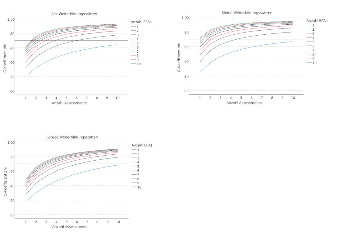 Schlussfolgerung: Häufige WBAs von EPAs waren sowohl in großen als auch in kleinen Weiterbildungsstätten durchführbar. Wir fanden keine signifikanten Unterschiede in der Anzahl der durchgeführten Assessments. Die für einen g-Koeffizienten > 0,7 erforderliche Mindestanzahl von Assessments war in großen und kleinen Weiterbildungsstätten erreichbar.