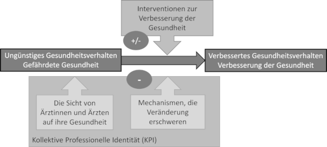 Aus der Literatur ist bekannt, dass zwischen verbal geäußerten Einstellungen und beobachtbaren Verhalten auf individueller Ebene häufig ein Widerspruch besteht [25], und es gibt eine Vielzahl von Forschungsarbeiten, die dieses Problem erklären und weiter untersuchen. Der Einfluss der beruflichen Identität auf Einstellungen und das tatsächliche Verhalten in Bezug auf die Gesundheit wurde bisher kaum untersucht. Obwohl sich gezeigt hat, dass die berufliche Identität für Ärzt*innen in vielerlei Hinsicht wichtig ist, gibt es keine allgemein anerkannte Definition des Konzepts, und die Definitionen variieren stark [26], [27]. Nach Cruess et al. [28] ist der Prozess der beruflichen Identitätsbildung („Professional identity Formation“, PIF) ein adaptiver Entwicklungsprozess, bei dem Individuen „ihre Erfahrungen zu einem sinnvollen Ganzen ordnen, das ihr persönliches, privates, öffentliches und berufliches ‚Selbst‘ umfasst“ ([28], S.2), was mit drei Bereichen zusammenhängt, die die Identität beeinflussen und entwickeln. Der individuelle Bereich umfasst die persönlichen Eigenschaften, die Überzeugungen über das eigene Selbst und die Auswirkungen der vielfältigen Lebenserfahrungen. Der Beziehungsbereich drückt den Einfluss bedeutender privater und beruflicher Personen auf die Identität aus. Der kollektive Bereich „spiegelt den Einfluss der sozialen Gruppen wider, denen ein Individuum angehört oder denen es beitreten möchte“ ([28], S.2). Wir werden diesen Bereich im Folgenden die kollektive berufliche Identität (KPI) nennen. Während wir wissen, dass sich Einstellungen, Überzeugungen und Wahrnehmungen im Rahmen des PIF-Prozesses im Allgemeinen ändern [28], [29], [30], [31], wurde bisher nur wenig darüber geforscht, wie der PIF-Prozess Wahrnehmungen und Einstellungen zur Gesundheit von Ärzt*innen prägen könnte.