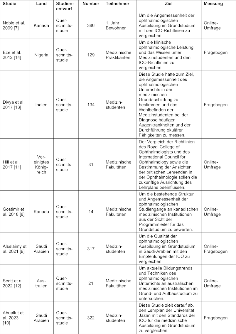 Die Ausbildung an medizinischen Fakultäten umfasst verschiedene Kriterien, die von der ICO festgelegt wurden. Die Forschungsteilnehmer waren Medizinstudenten, Praktikanten, Assistenzärzte und medizinische Einrichtungen. Die ICO-Leitlinien für die medizinische Ausbildung lauten 20-36% [7], [8], [11], [12]. Vier Studien enthielten keine Informationen oder Daten [9], [10], [13], [14].